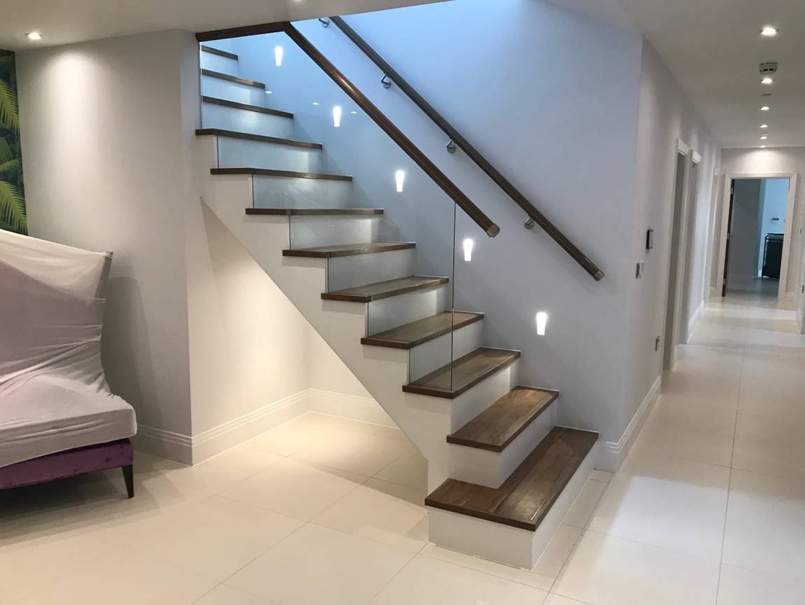 - A modern or imitation cut string staircase is typically paired with a glass balustrade