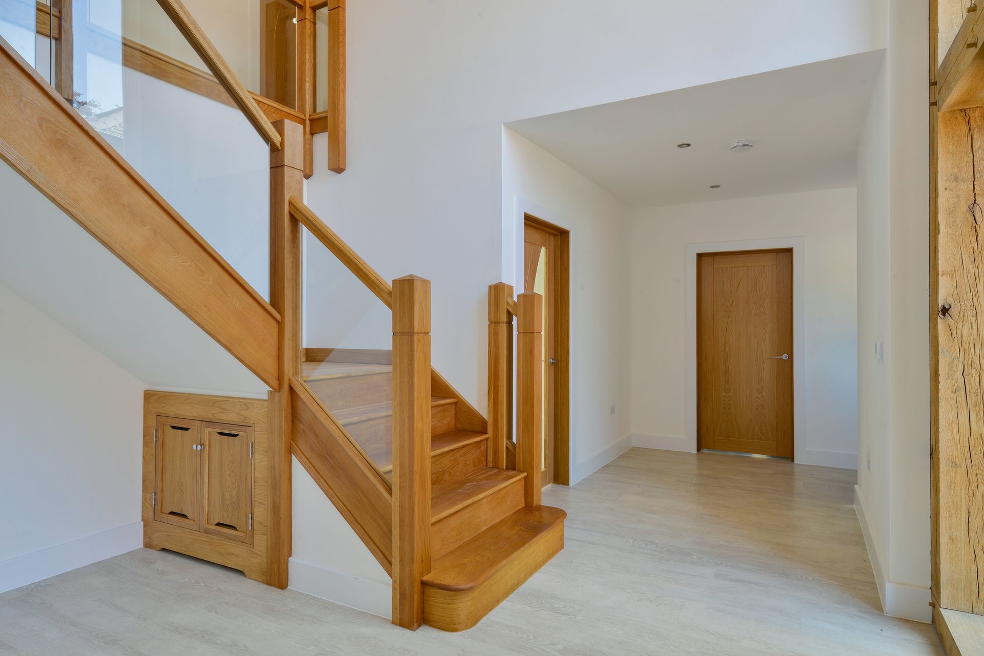 A traditional staircase may be specified with either traditional spindles or a glass balustrade, depending on the layout of the home and the requirements of the project.